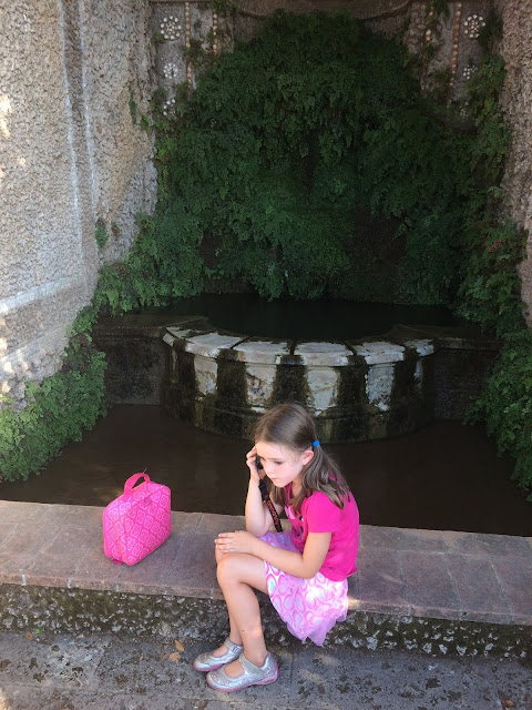 finally, we were able to explore the gardens themselves. it felt at least ten degrees cooler here than in Rome, and the misting spray from the fountains was delightfully refreshing. of course, around five o'clock, the mosquitoes started to come out in full force. they have teeny mosquitoes here called tigre or tiger mosquitoes, and their bites are insanely itchy. poor Cecilia always gets terrible reactions to them, so now i'm vigilant about bug spray. i doused the girls and myself (Nick opted to take his chances as the mosquitoes never seem to bother him that much) and we were back to uninterrupted enjoyment of the elaborate gardens!